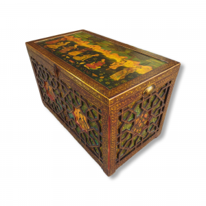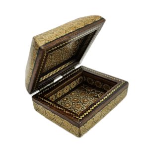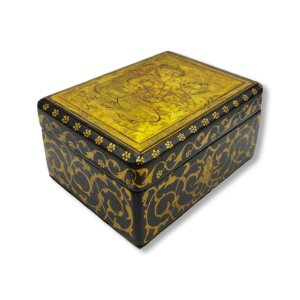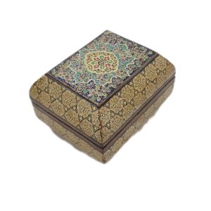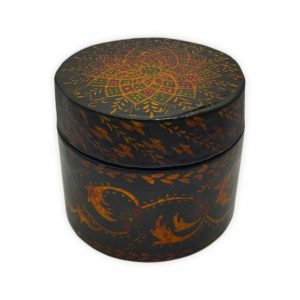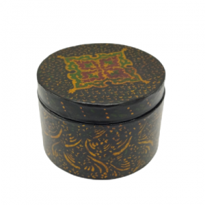 Round jewelry box made of papier-mâché, decorated with traditional miniature painting in Tazhib (illumination) and Gol-o-Morgh (flower and bird) motifs.