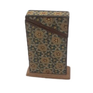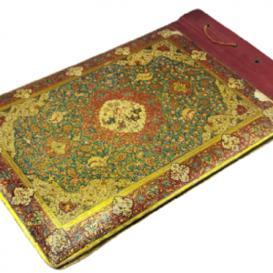 An old wooden album with a gold overlay, featuring Islamic arabesque (Eslimi), Tazhib (Illumination), and Toranj (medallion) motifs. The decorative elements include detailed depictions of birds and quadrupeds.