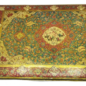 Hand-painted MDF tray featuring a high-quality traditional Gol-o-Morgh (flower and bird) miniature design, created using watercolor and gouache techniques.