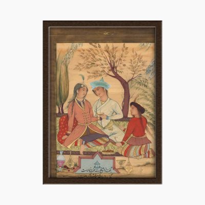This work is a recreation of the original piece by Master Moein Mosavvar, a prominent artist of the Safavid era. The original artwork dates back to 1075 SH. Note that in this recreation, the faces have been altered to depict more Iranian features rather than those of the Far East.
