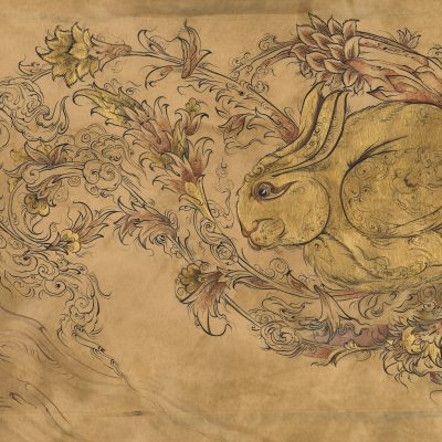 Miniature artwork on cardboard featuring a Tazhib-style painting with a rabbit in a flower garden.