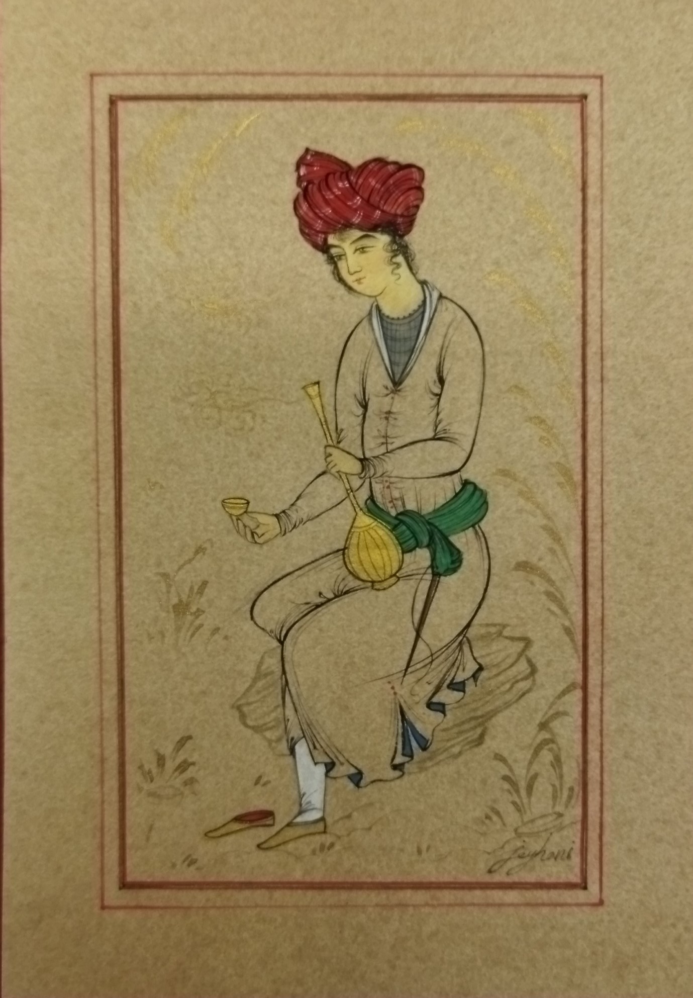 Miniature painting on aged paper, created in the Safavid artistic style, reflecting the elegance and detail of classical Persian art.