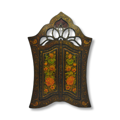 Papier-mâché mirror featuring traditional miniature-style painting (Gol-o-Morgh / Flower and Bird).