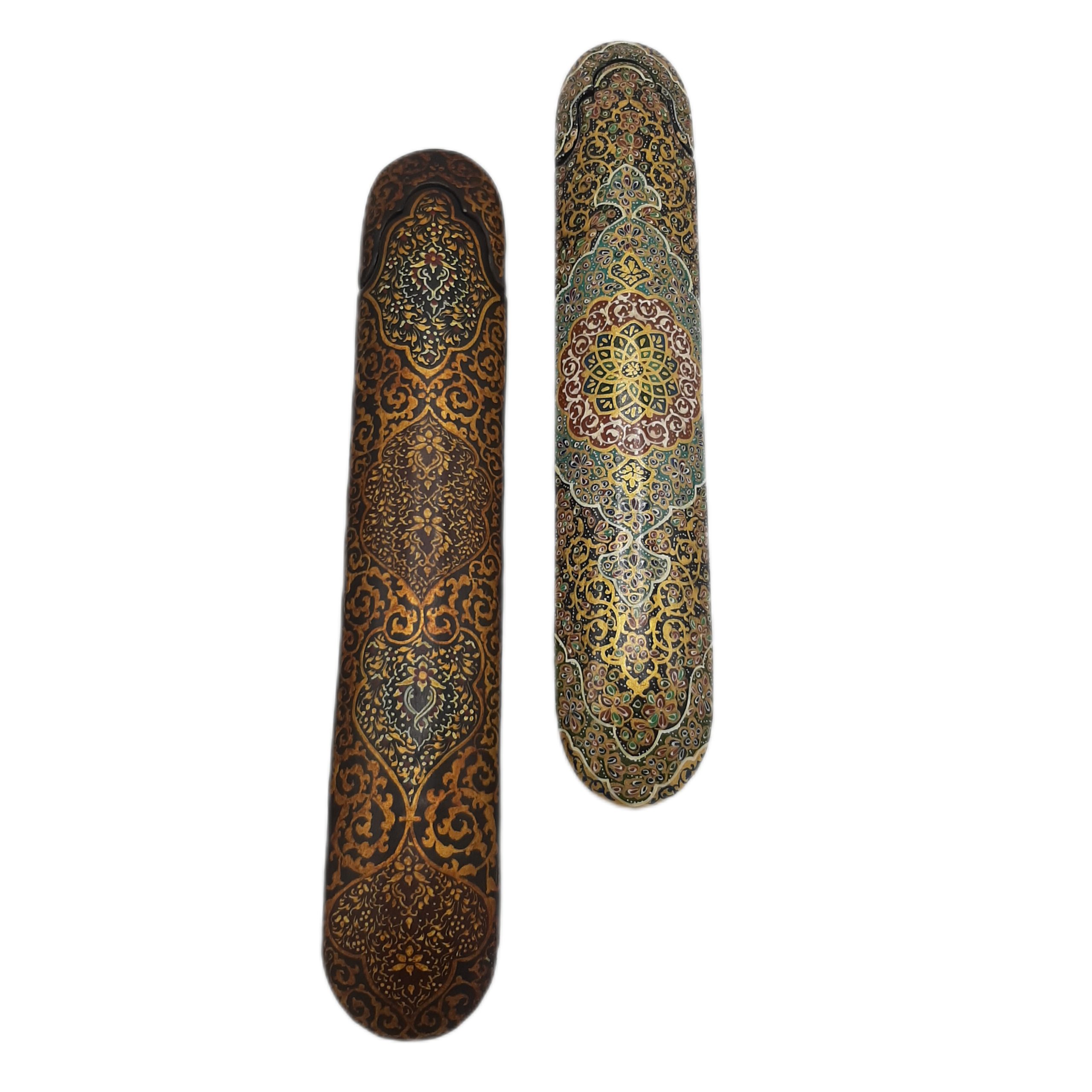 papier-mâché pen case featuring Tazhib (illumination) and Eslimi patterns.