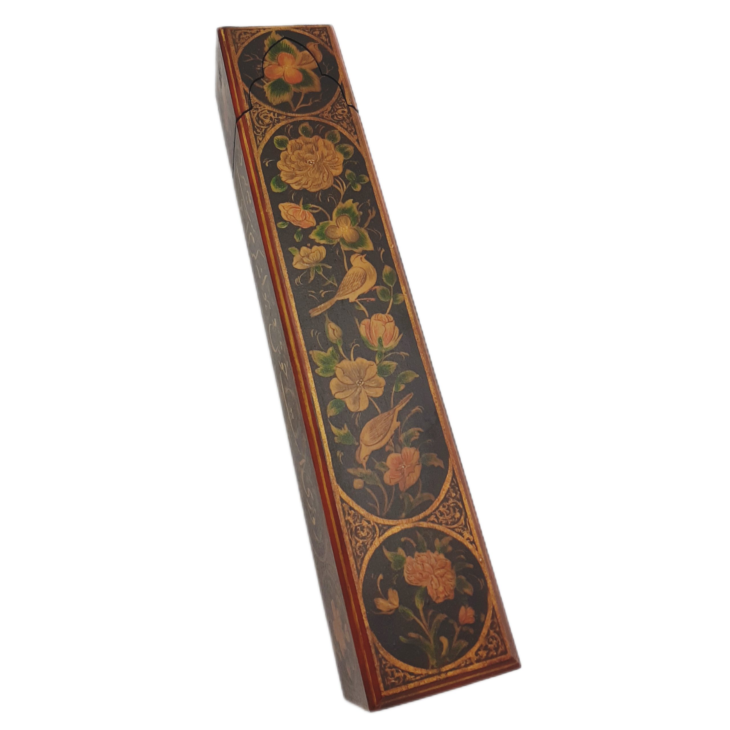 walnut wood pen case featuring Flower and Bird motifs and calligraphy design.